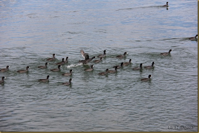 The poor ducks were by the dam and kept getting swept backwards. Finally a bunch just took off and flew instead.